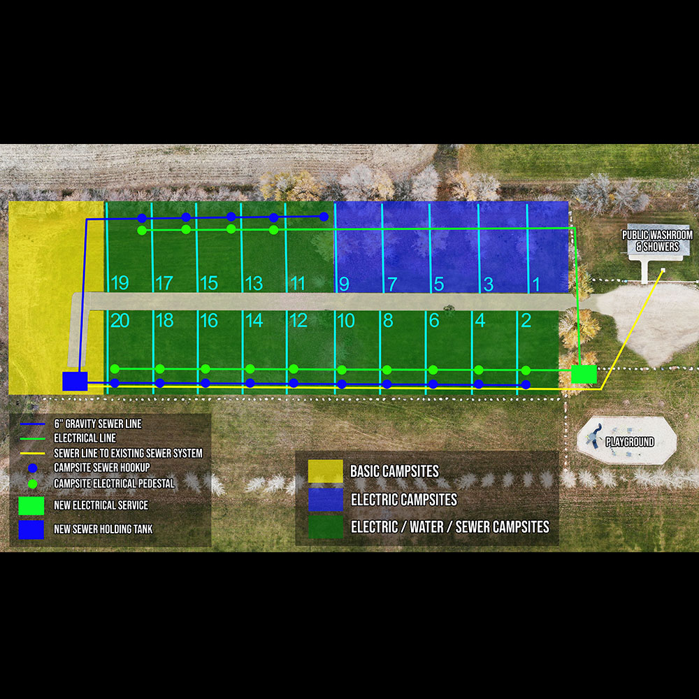 Our plan is to add full service campsites to our existing campground. Our expansion plan is to add an additional 14 campsites that have electric, water and sewer services. We would also run water and sewer to one of the existing electrical campsites for a total of 15 full service sites, and 5 electrical sites.