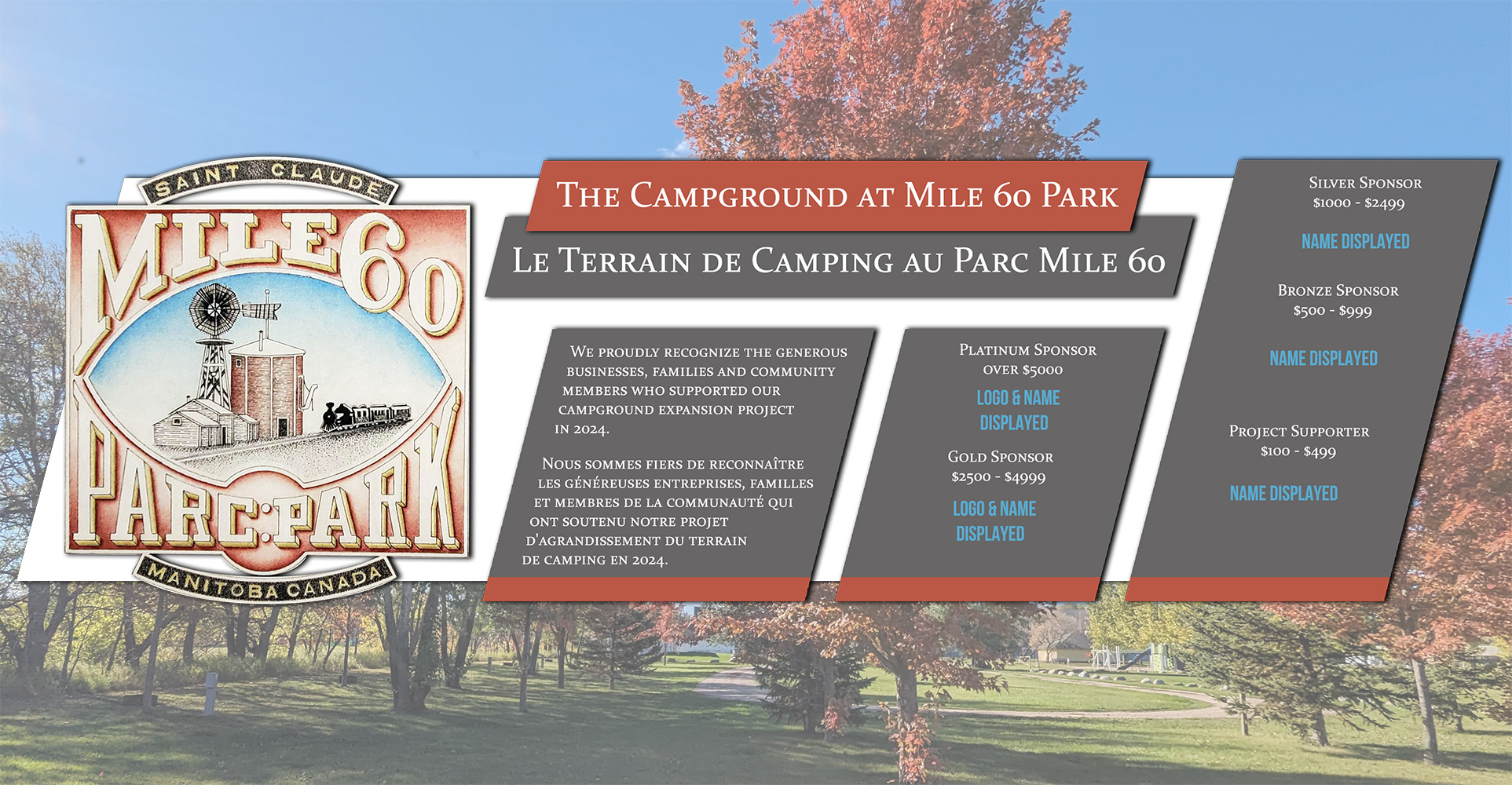 Mile 60 Park is not a registered non-profit organization. As a result, all monetary donations have to be made through the Rural Municipality of Grey. The RM of Grey has agreed to process the donations made, submit a donation receipt to the individual or business making the donation, and transfer the funds to the Mile 60 Park Committee.